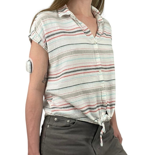 Weatherproof Vintage Colorful Striped Button Down Tie Up Washable Linen Blouse