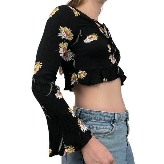 L.A. Hearts Black Floral Long Bell Sleeve Lace Up Cropped Top