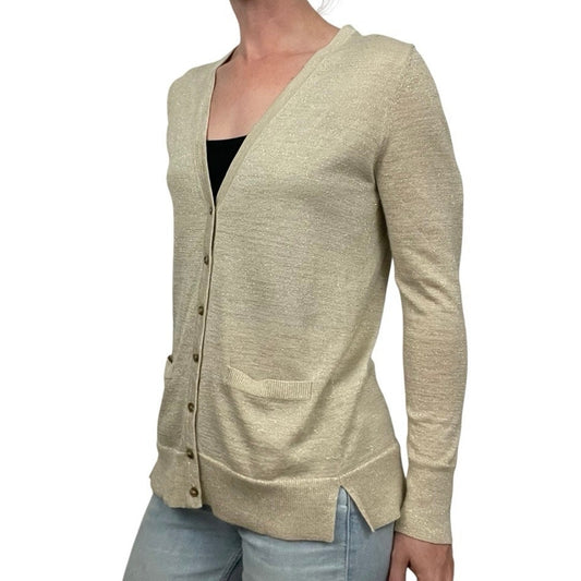 Ann Taylor LOFT Glittery Metallic Gold Cream Button Down Cardigan Sweater