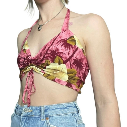 Hibiscus Collection Hawaii Tropical Floral Halter Neck Open Tie Back Cropped Top