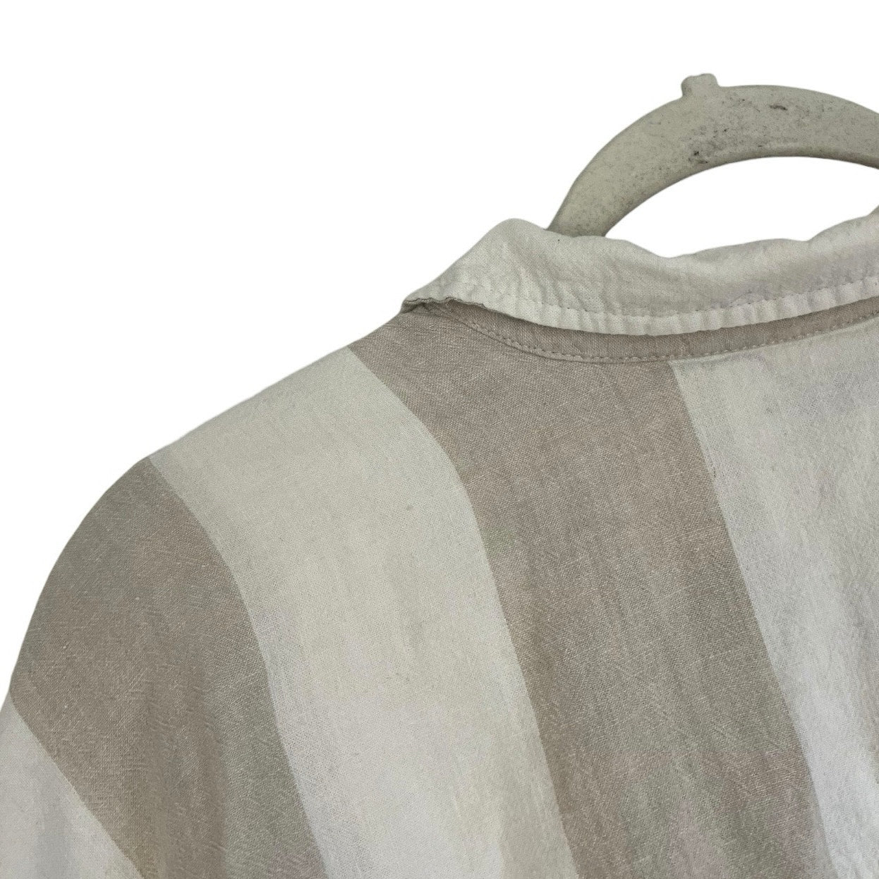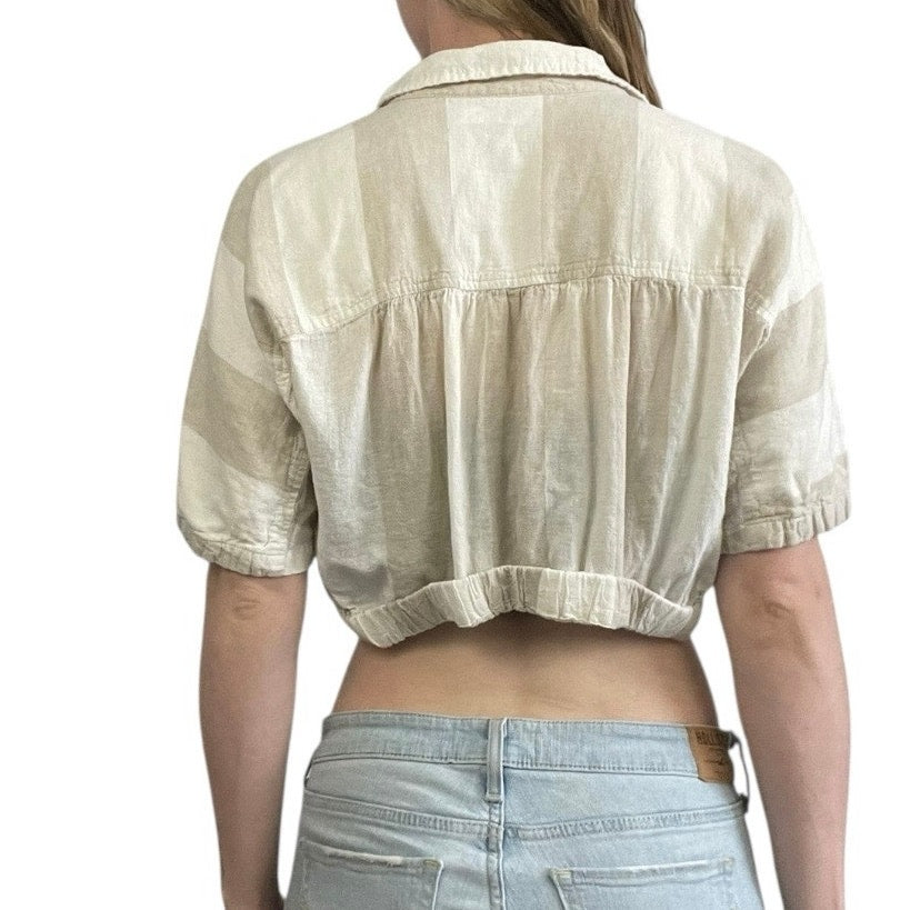 Adorable beige and white striped cropped button down collared blouse that ties at the front hem