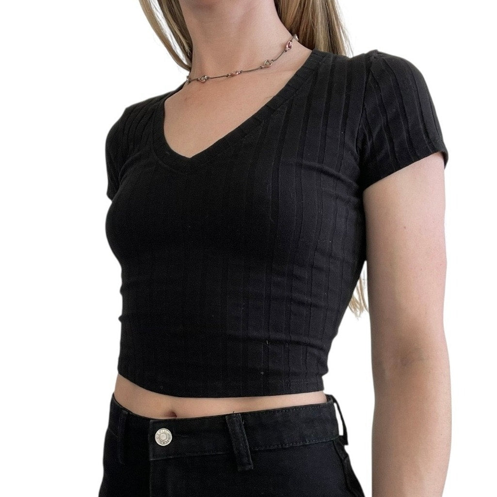 The perfect black ribbed cropped short sleeve v-neck top