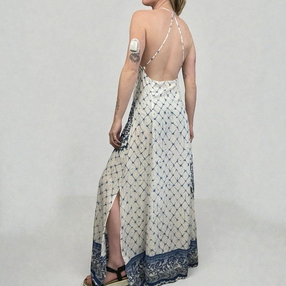 Desigual White & Blue Boho Halter Cross Open Back Side Slit Maxi Dress