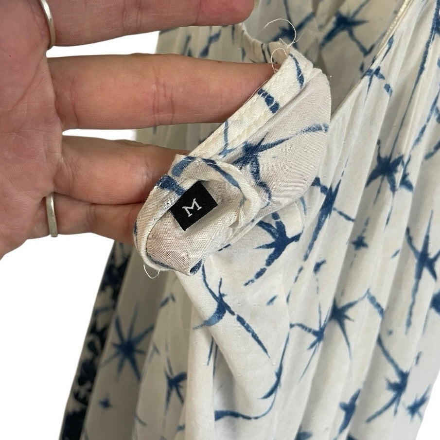 Beautiful lightweight white and blue boho print maxi dress with an oversized mandala at the hip and intricate floral pattern along the hem.