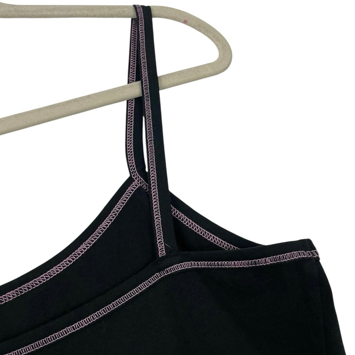Pink contrast stitching along the hem and straps.