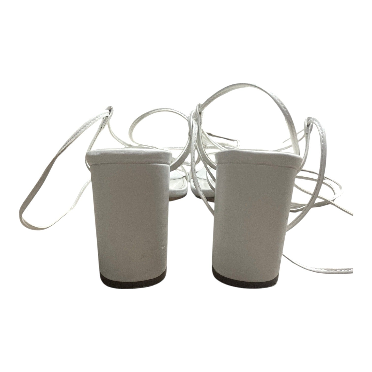 Incredible white strappy lace up faux leather open toe high block heels