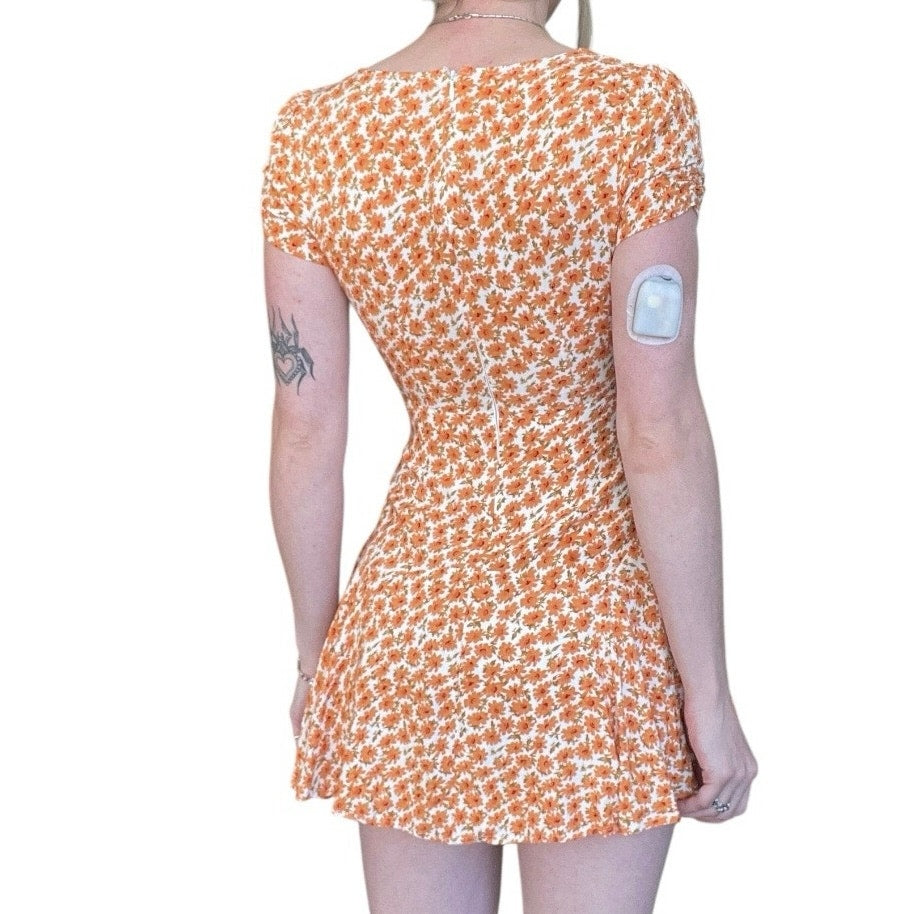 Adorable orange and white floral print a-line v-neck short sleeve mini dress
