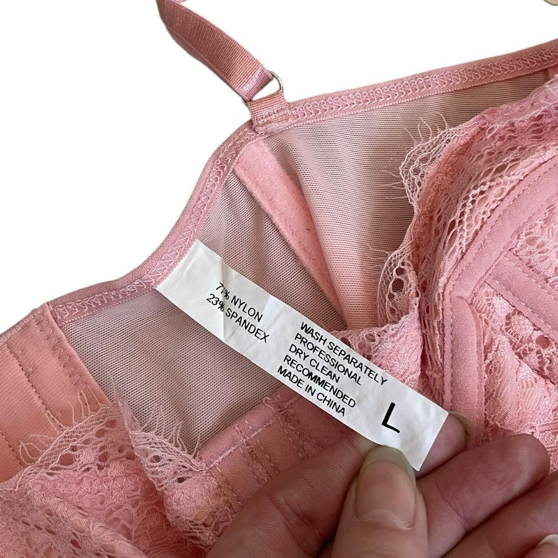 Adorable light pink corset-style cropped bustier top with floral lace detailing.