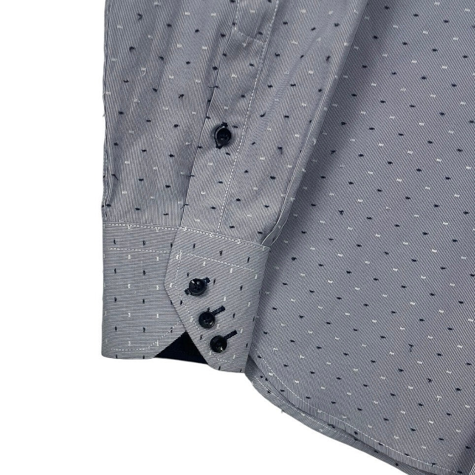 Mens blue with black and white polka dot textured embroidery long sleeve button down collared dress shirt