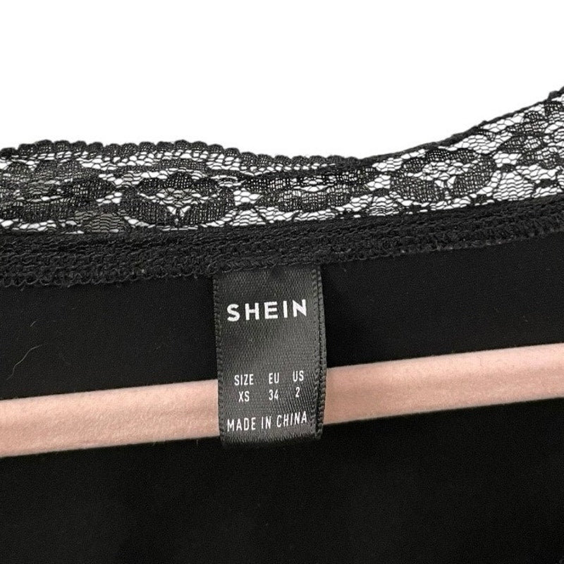 SHEIN Black Silky Lace Trim Tie Front Cropped Short Sleeve Blouse
