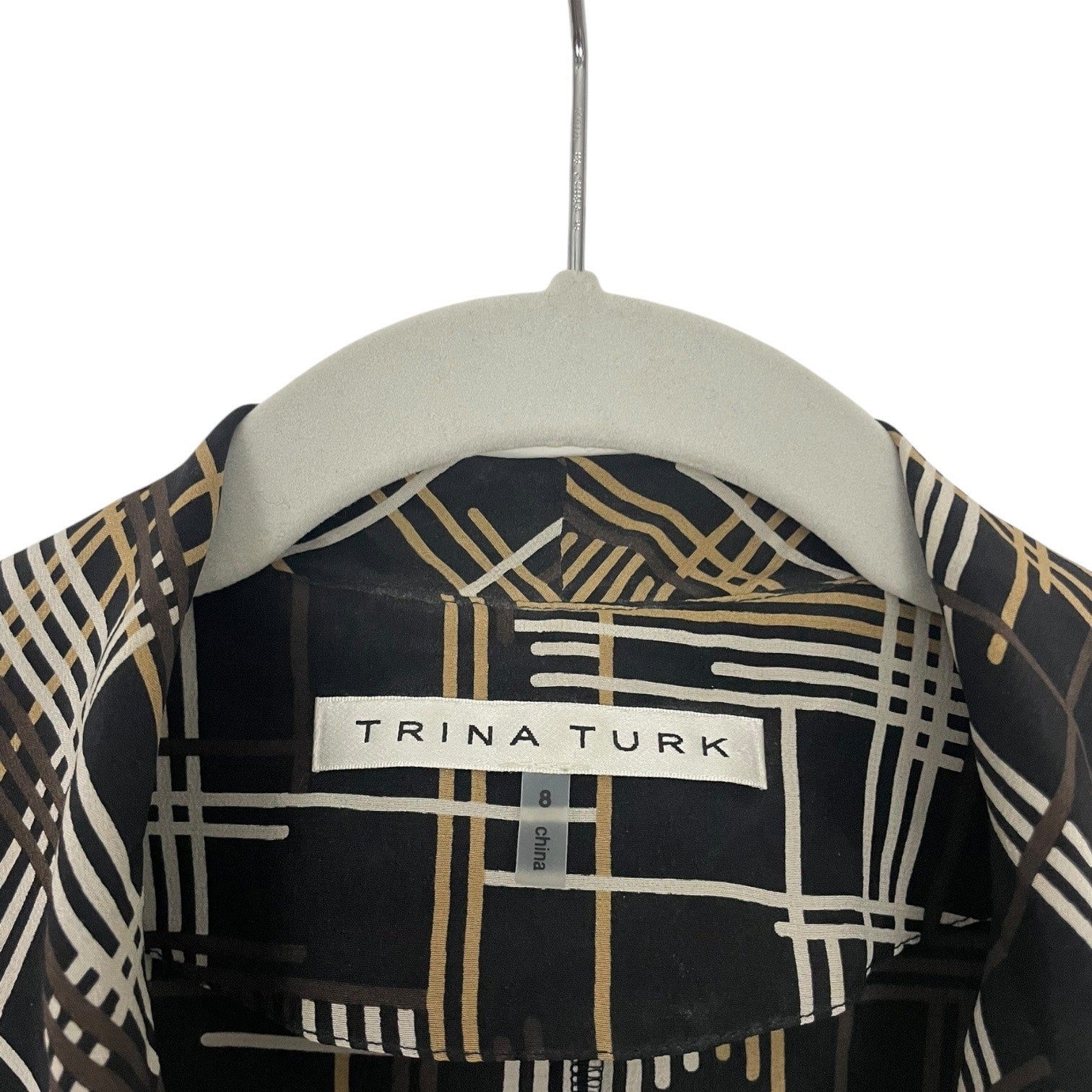 Trina Turk Black & Brown Silk Long Sleeve Button Down Tie Neck Blouse