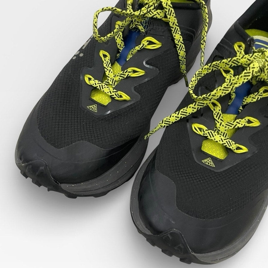 Incredible mens Craft CTM Ultra Carbon Trail high-performance trail running athletic sneakers in sleek black with vibrant lime green laces.